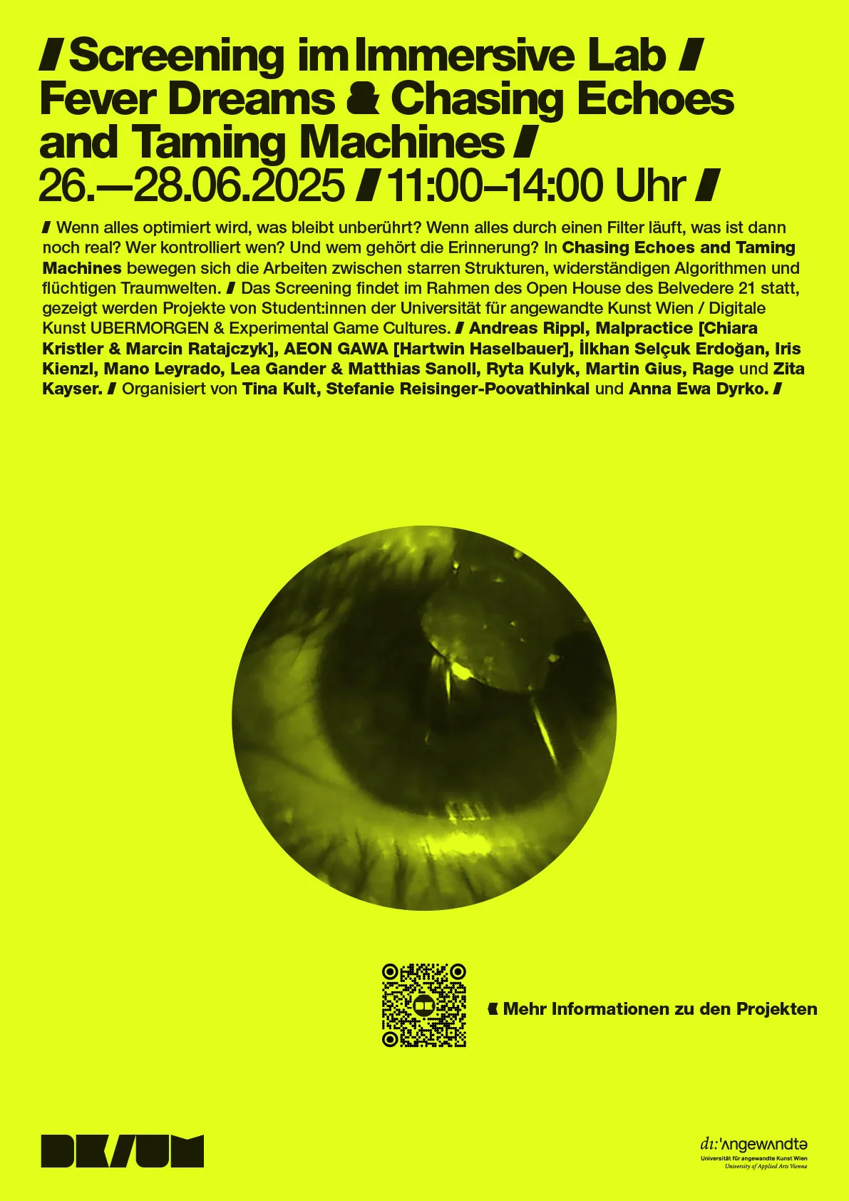 Das Screening findet im Rahmen des Open House des Belvedere 21 statt, gezeigt werden Projekte von Student:innen der Digitalen Kunst und Experimental Game Cultures. Organisation: Tina Kult, Stefanie Reisinger-Poovathinkal und Anna Ewa Dyrko.